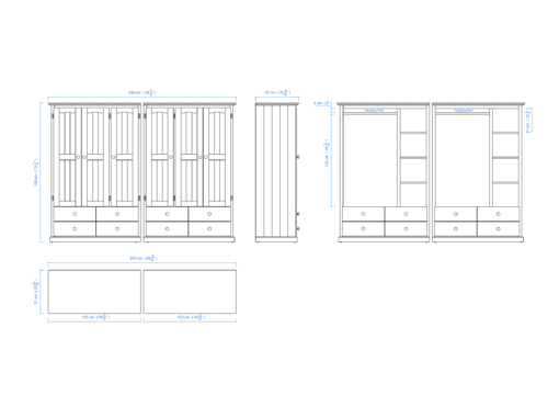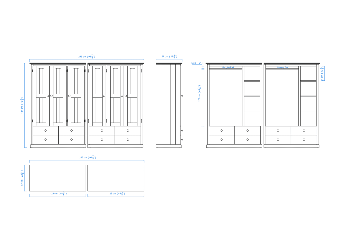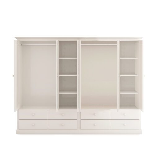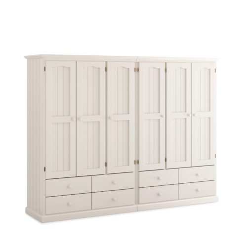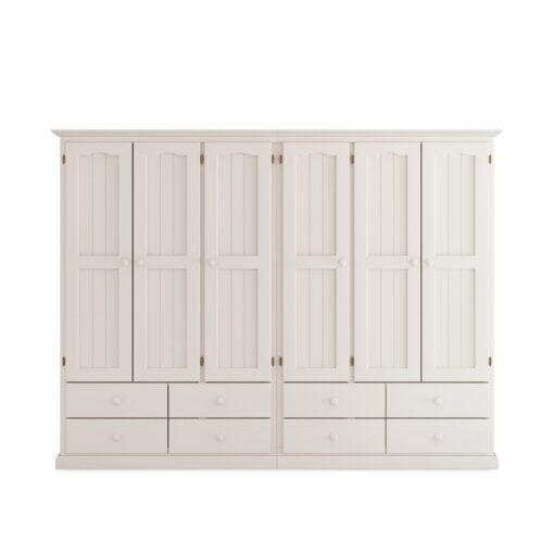 Upgrade your storage with the Australian Made Heritage 250cm 6 Door 8 Drawer combination Hanging and Shelving Robe. Crafted from solid timber, this wardrobe features three doors with a combination of hanging, shelving and four drawers. Huge range of customizable colours. No assembly required.