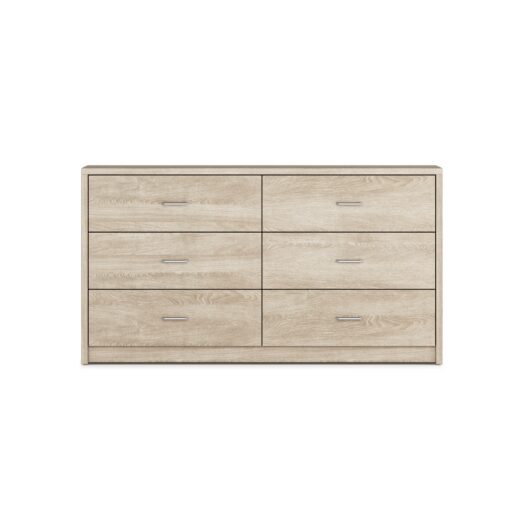 The Nook Dresser offers sleek storage with a warm grey oak finish, LED lighting, and six spacious drawers to keep your bedroom organized.
