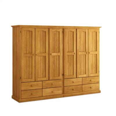 Upgrade your storage with the Australian Made Heritage 250cm 6 Door 8 Drawer combination All Hanging Robe. Crafted from solid timber, this wardrobe features three doors with a combination of hanging, shelving and four drawers. Huge range of customizable colours. No assembly required.
