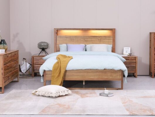 Transform your bedroom with the Fremantle, crafted from Australian Mari hardwood and featuring built-in LED lighting for a touch of luxury. Designed for those who value quality and style, each piece showcases the natural beauty of timber grain, making every bed unique.